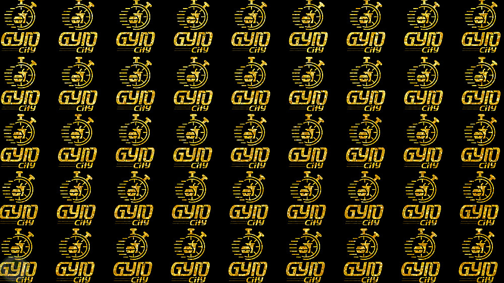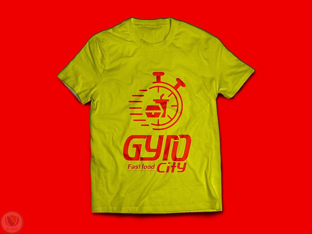 النص "GYM Fast Food City" يأتي بخطوط أنيقة؛ "GYM" بخط كلاسيكي قوي، و"Fast Food City" بخط أصغر وأكثر سلاسة. الألوان (أحمر وأصفر وأبيض) تعزز الوضوح وجاذبية الشعار.