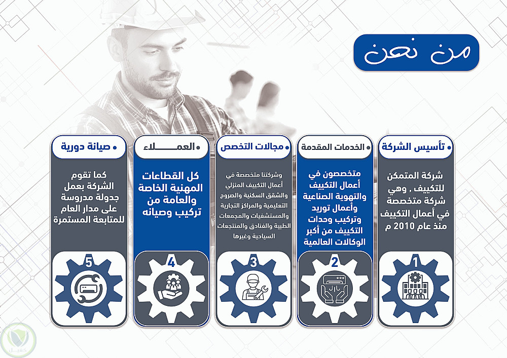 قمت بتصميم بروفايل احترافي يعكس هوية شركة المتمنكن للتكييف، بدءاً من تأسيسها عام 2010 وحتى خدماتها المتقدمة في مجال التكييف والتهوية. تم اعتماد أسلوب بصري واضح يعتمد على التدرج الزمني والترتيب الرقمي لتسهيل القراءة، مع دمج الأيقونات التوضيحية التي تعزز الفهم البصري للمحتوى.