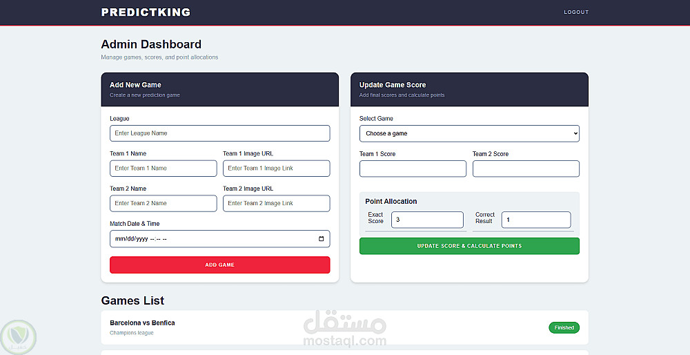 PredictKing هو موقع ألعاب عبر الإنترنت حيث يمكن للمستخدمين كتابة توقعاتهم حول الأحداث الرياضية الواقعية. كلما كانت توقعاتك دقيقة، كلما حصلت على نقاط أكثر! تنافس مع الأصدقاء والمستخدمين الآخرين، واصعد في لوحة المتصدرين، واستمتع بتحدي معرفتك الرياضية. سواء كنت من محبي كرة القدم، كرة السلة، أو أي رياضة أخرى، PredictKing يوفر لك تجربة تفاعلية ممتعة لتختبر مهاراتك في التنبؤ وتصبح الملك الحقيقي للتوقعات!