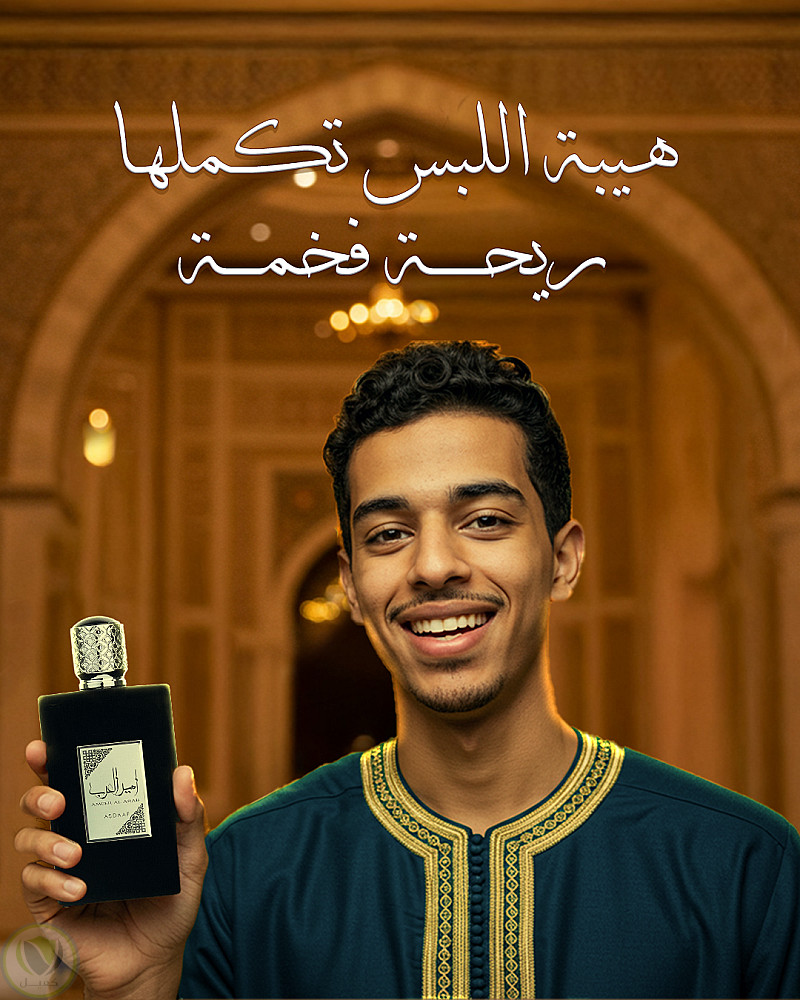 يسرني أن أشارك معكم أحد أعمالي المميزة في تصميم الإعلانات البصرية لعطر رجالي يتميز بالفخامة والجاذبية. في هذا العمل، تم دمج الطابع العربي الكلاسيكي مع لمسة عصرية لخلق تجربة بصرية تعكس الأناقة والتميز.