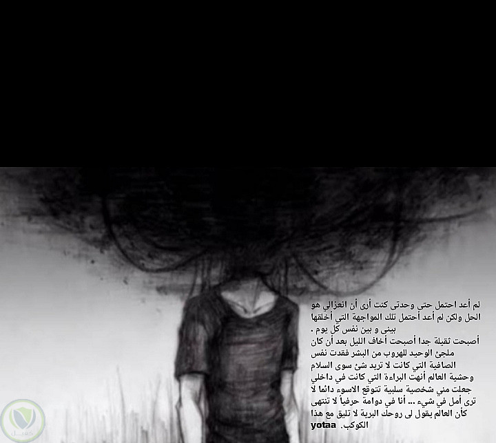 "لم أعد احتمل حتى وحدتي... كنت أرى أن انعزالي هو الحل ولكن لم أعد أحتمل تلك المواجهة التي أخلقها بيني وبين نفسي كل يوم.
