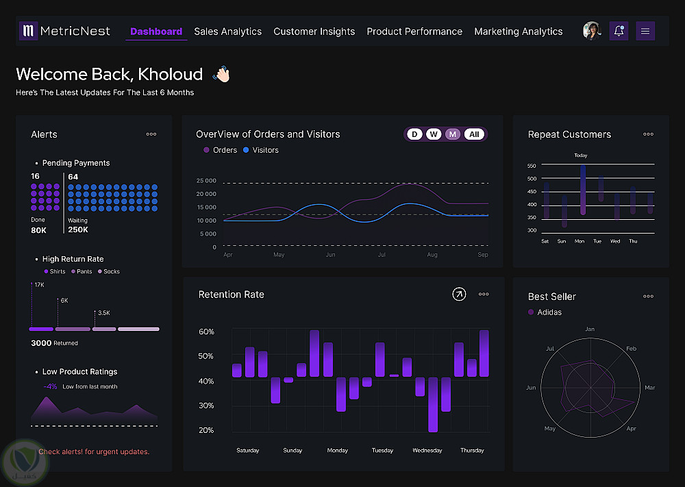 في هذا المشروع، قمتُ بتصميم لوحة تحكم تفاعلية لمتجر إلكتروني، تهدف إلى تقديم تجربة مستخدم سلسة وفعّالة لإدارة العمليات التجارية ومراقبة الأداء.