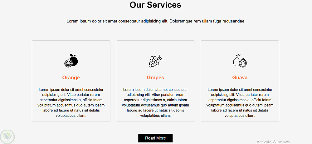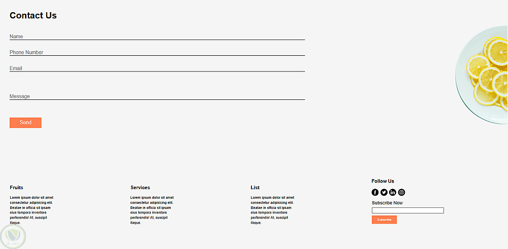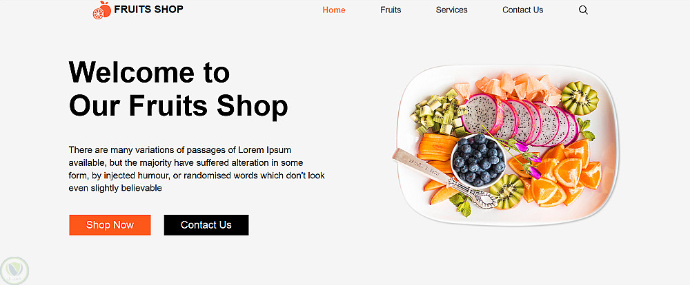- شريط تنقل علوي يحتوي على روابط للأقسام المختلفة (Home, Fruits, Services, Contact Us).