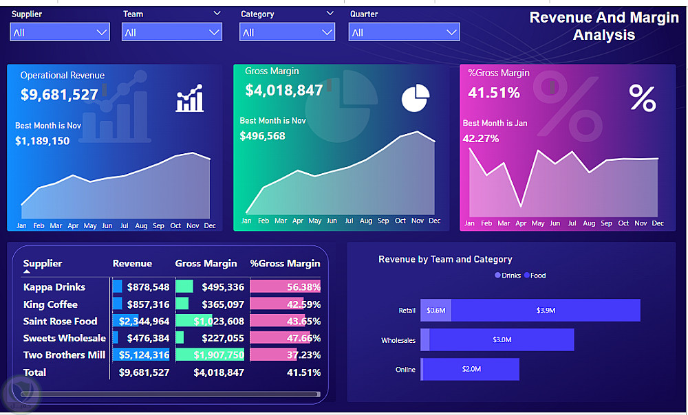 في هذا المشروع، قمت بتصميم لوحة تحكم ديناميكية باستخدام Power BI تهدف إلى تحليل الإيرادات وهوامش الربح لمجموعة من الموردين والفرق والفئات المختلفة على مدار السنة.