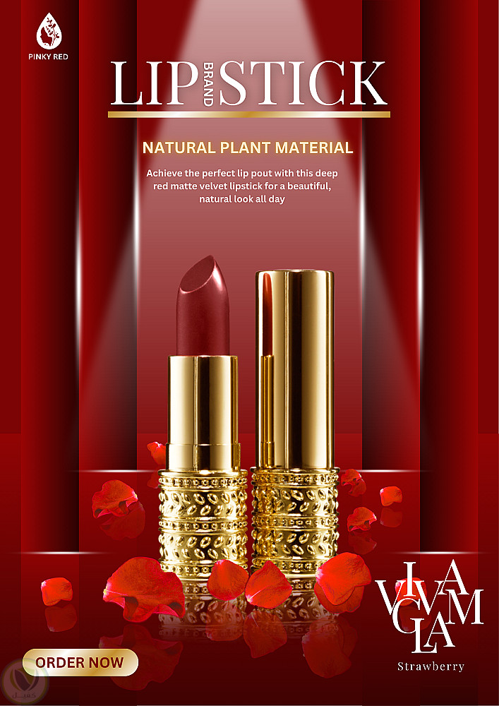 تصميم بوستر إعلاني عن مستحضر تجميل للشفاه من خلال التطبيق الاحترافي CANVA مستخدمة فيه ألوان عصرية وجذابة تعكس فخامة المنتج