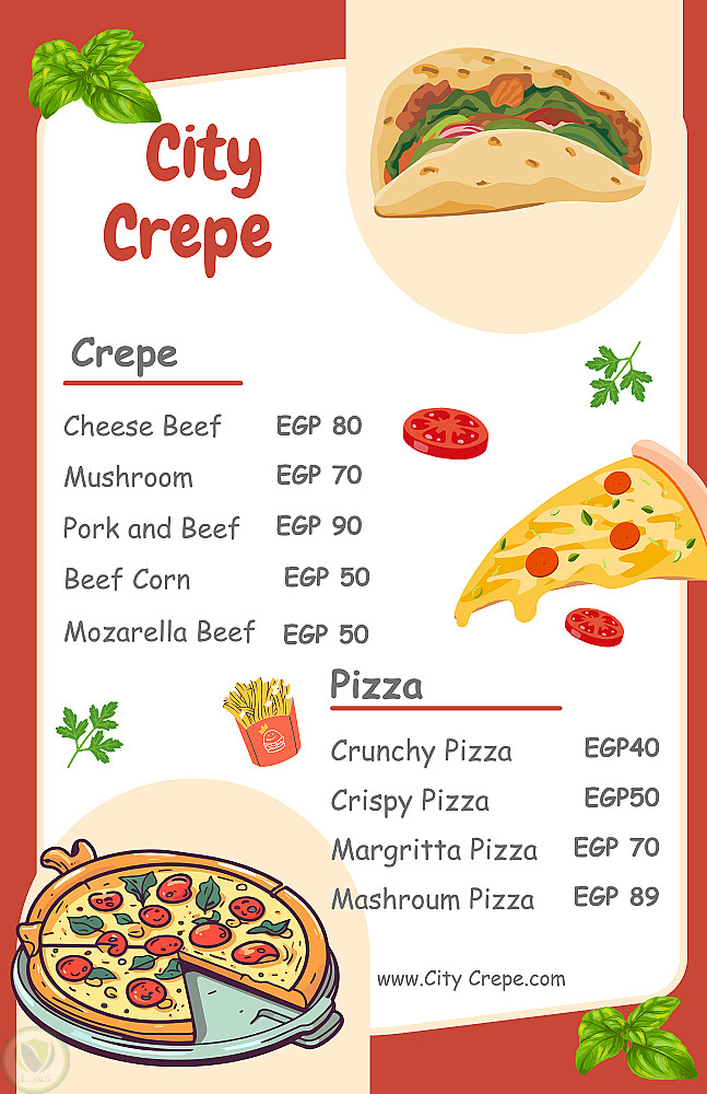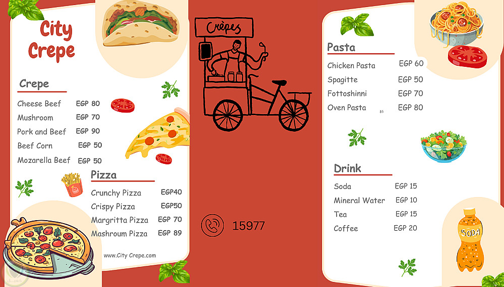 تم تصميم منيو مطعم City Crepe بطريقة جذابة وعصرية تناسب طبيعة المكان وطابع منتجاته المتنوعة.