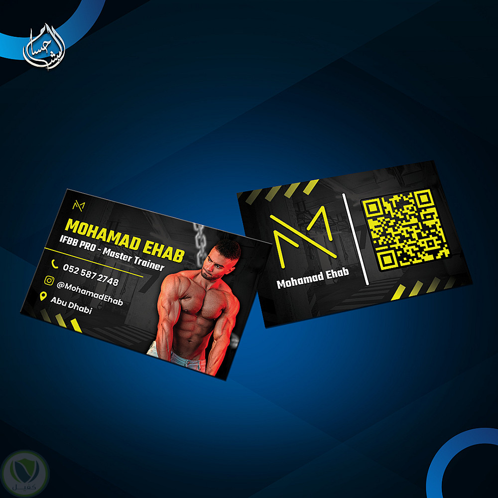 - كارت لمدرب رياضي (كوتش)، بأسلوب ديناميكي وألوان قوية تعكس الطابع الرياضي