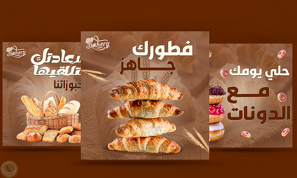 مجموعة من أعمالي في تصاميم السوشيال ميديا لمخبز محلي، بتعتمد على ألوان دافئة، صور شهية، وخطوط واضحة تعكس جودة المنتجات وتوصل الرسالة بسرعة.