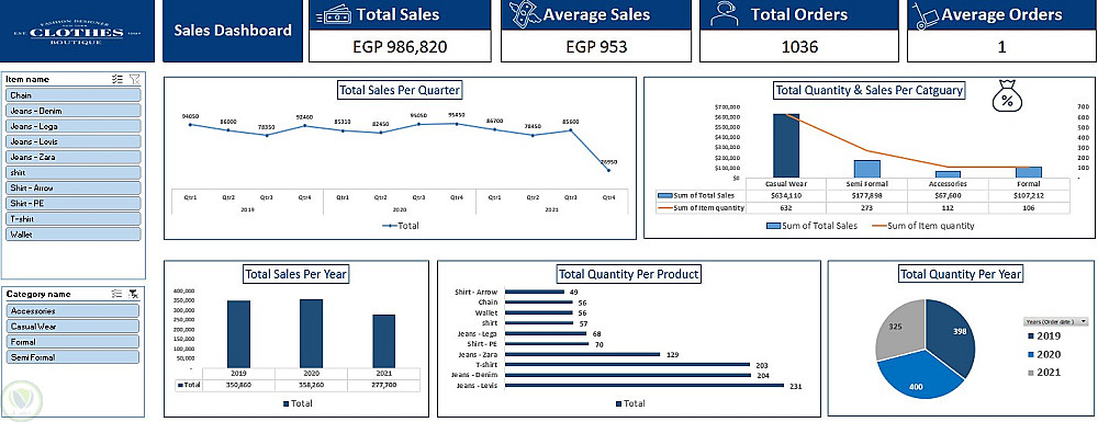 داشبورد مبيعات لمتجر أزياء باستخدام Excel – تحليل ربعي وسنوي