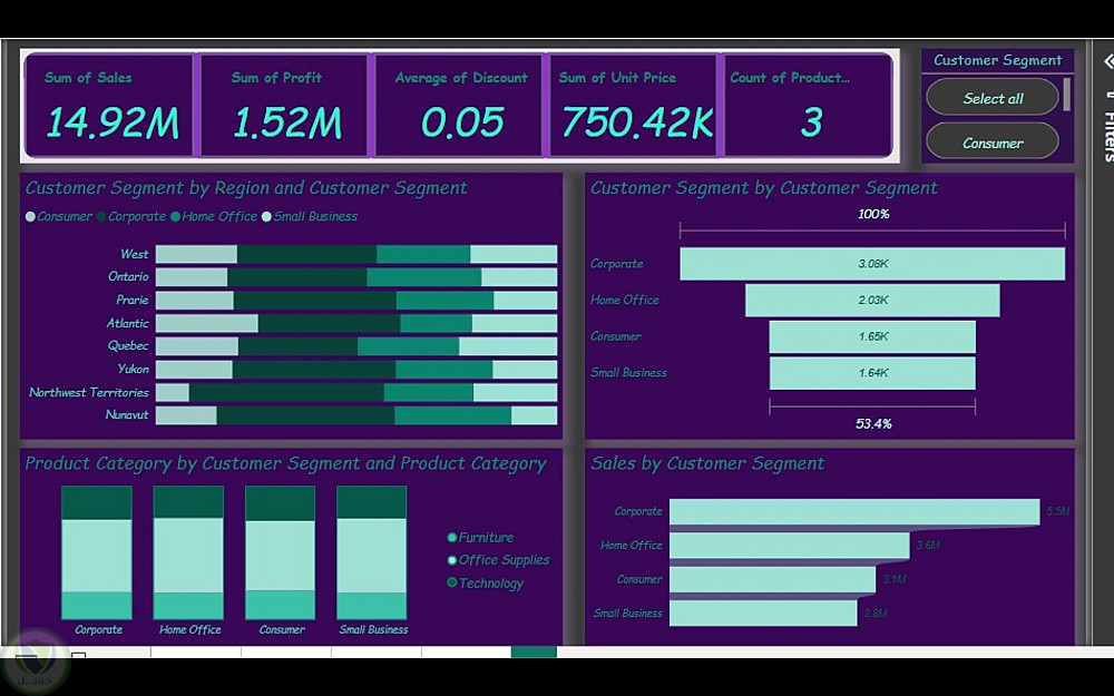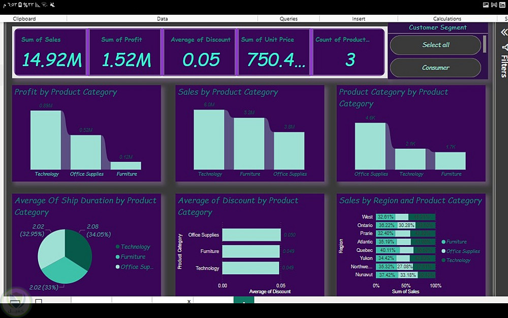 كما تقدم اللوحات رؤى حول الأرباح حسب فئة المنتجات، والمبيعات حسب المناطق، وتقسيم العملاء وفقًا للشرائح المختلفة. بالإضافة إلى ذلك، يتم تحليل مدة الشحن ومتوسط الخصم حسب الفئة، مما يوفر رؤية أوضح لاتجاهات الأداء وتحسين العمليات التشغيلية.