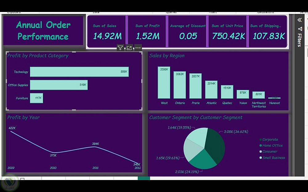 تعرض هذه اللوحات التفاعلية تحليلًا شاملاً لأداء الطلبات السنوي من خلال Power BI، مما يساعد في اتخاذ قرارات تعتمد على البيانات. تتضمن التحليلات مقاييس رئيسية مثل إجمالي المبيعات والأرباح ومتوسط الخصم وأسعار المنتجات وتكاليف الشحن.