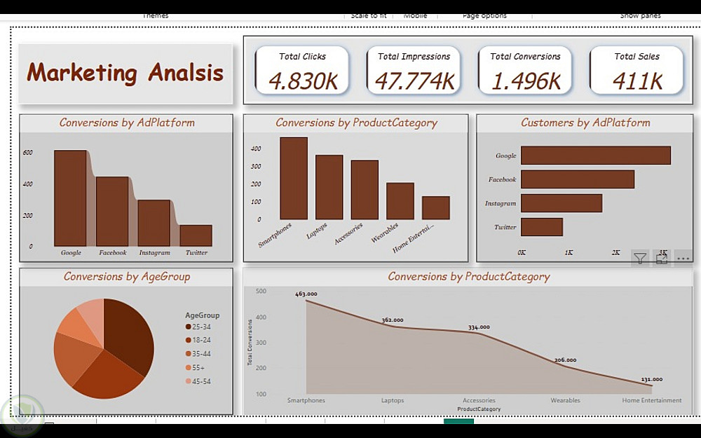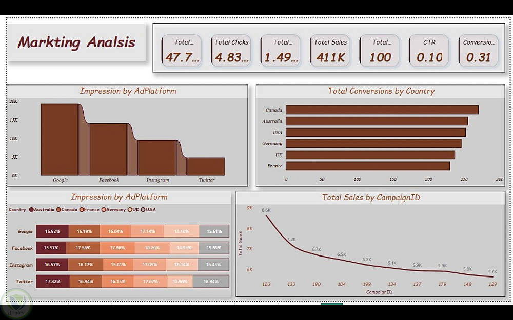 بإجراء تحليل شامل لبيانات التسويق باستخدام Excel وPower BI لإنشاء لوحات معلومات تفاعلية تعرض أداء الحملات الإعلانية عبر مختلف المنصات (Google، Facebook، Instagram، Twitter).