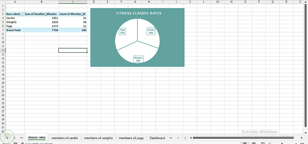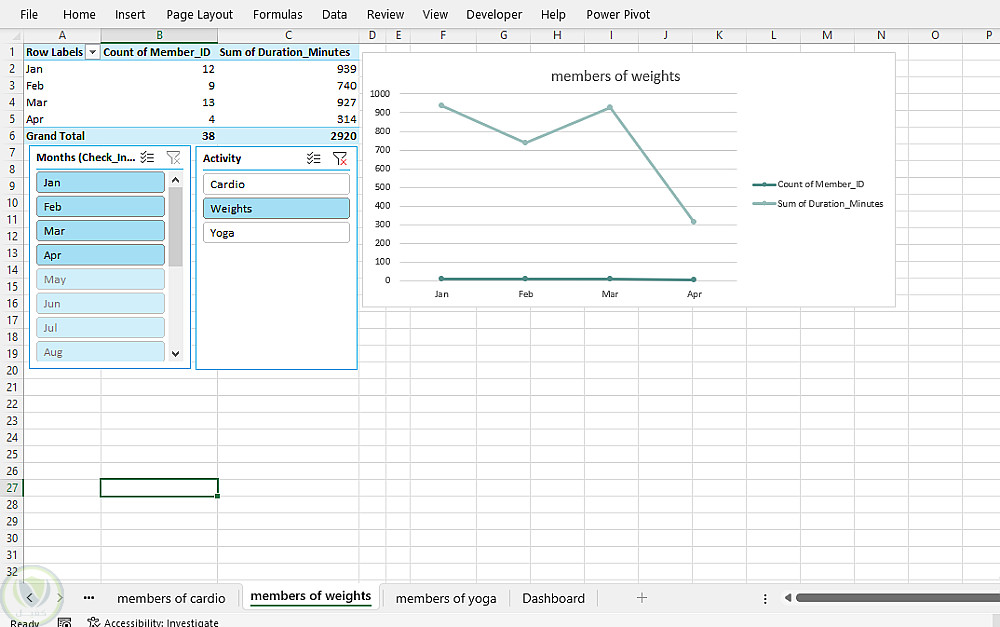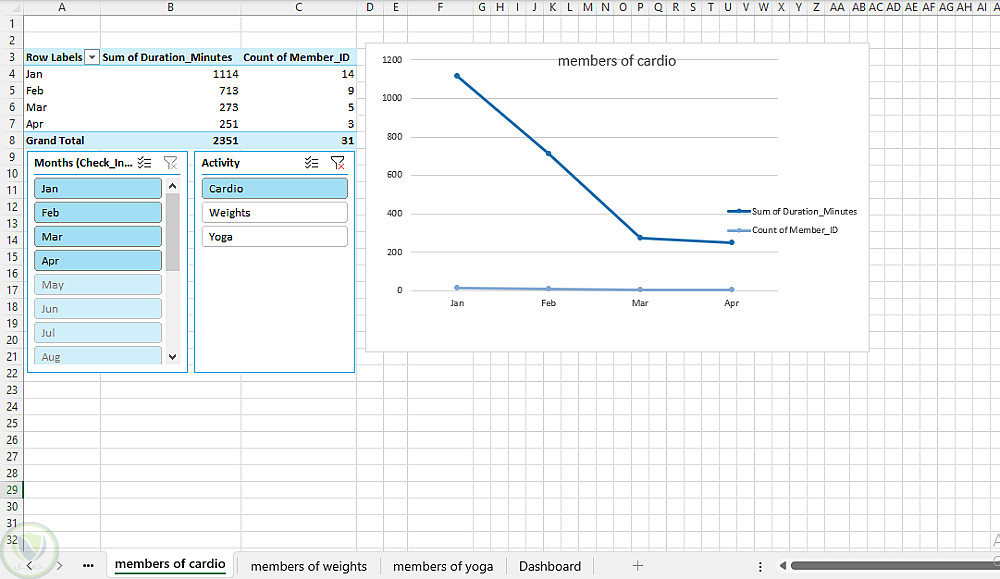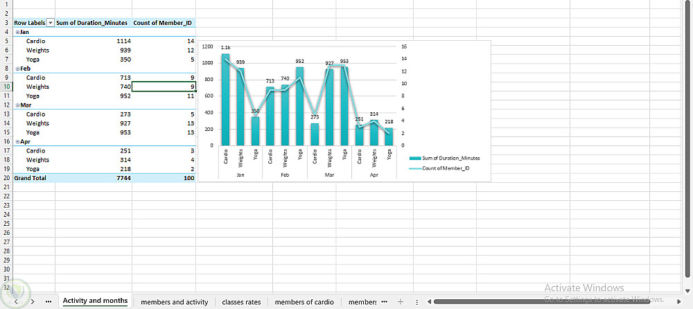 تم تنفيذ مشروع لتحليل بيانات مركز لياقة بدنية يهدف إلى تتبع استخدام الأعضاء للأنشطة الرياضية (كارديو – أوزان – يوجا) خلال فترة زمنية. يشمل التحليل عدد الأعضاء، مدة التمارين، وتوزيع الأنشطة شهريًا.