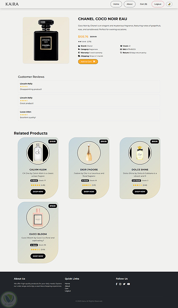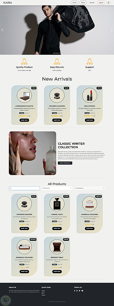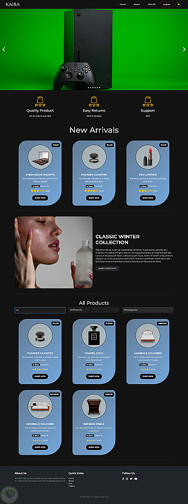 قمت بتطوير موقع تجارة إلكترونية باستخدام reactjs و Bootstrap، مع إضافة خاصية التوثيق (Authentication) بحيث يمكن للمستخدمين التسجيل وتسجيل الدخول. الموقع يتيح للمستخدمين القيام بكل العمليات الأساسية لمتجر إلكتروني مثل تصفح المنتجات، إضافة المنتجات إلى السلة، وإتمام عملية الدفع. كما تم تضمين الوضعين الفاتح والداكن (Light & Dark Mode) لتحسين تجربة المستخدم.