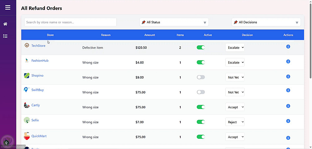 قمت ببناء لوحة تحكم لإدارة طلبات الاسترجاع بشكل فعال. طورت جدولًا قابلًا لإعادة الاستخدام وديناميكيًا مع تحديثات في الوقت الفعلي، وأزرار تحكم لكل صف (قبول/رفض/تصعيد)، وتكامل مع API باستخدام JSON Server، بالإضافة إلى إشعارات Toast لتقديم تعليقات فورية للمستخدم.