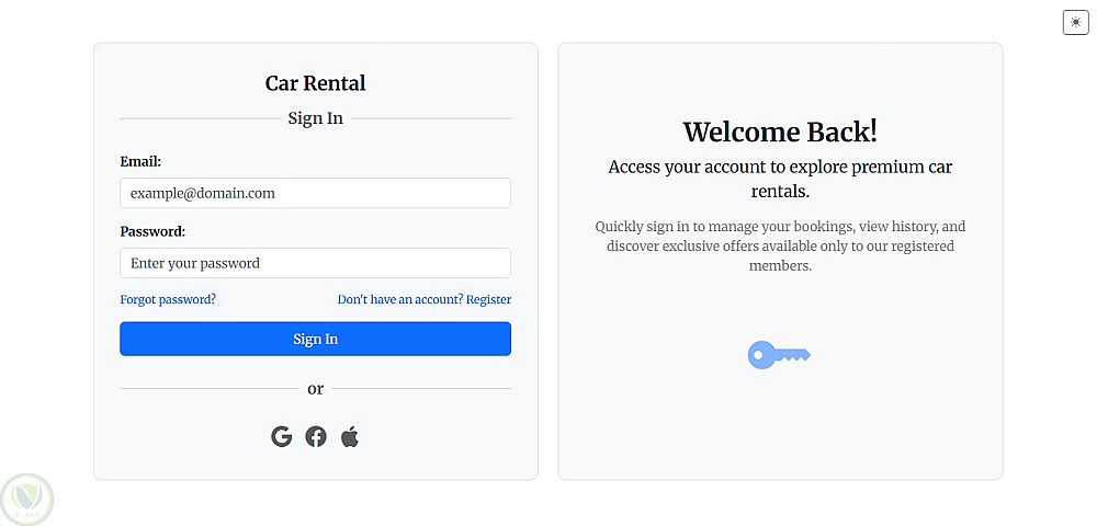 تصميم واجهة صفحة تسجيل دخول لخدمة تأجير السيارات (Car Rental) باستخدام HTML، CSS، وBootstrap لإنشاء تصميم متجاوب وجذاب.