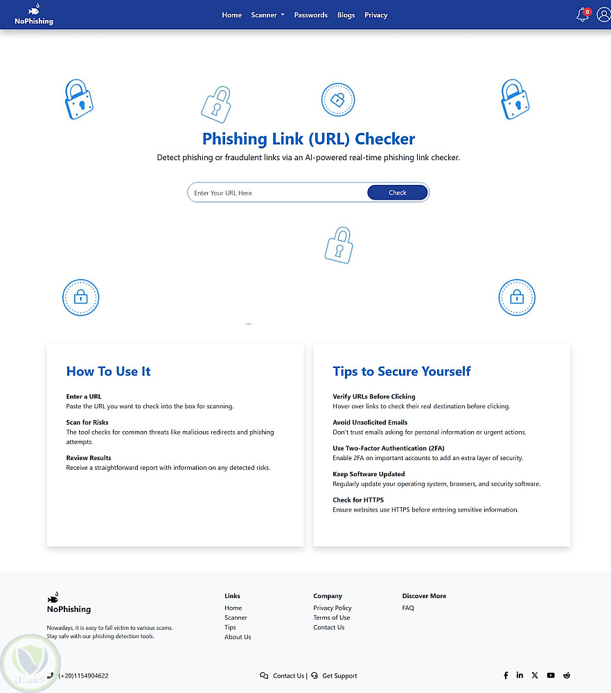 موقع ويب يهدف إلى اكتشاف روابط التصيّد الاحتيالي وتحذير المستخدمين منها. يعتمد المشروع على دمج واجهات برمجة التطبيقات (APIs) مثل Google Safe Browsing، لتحديد ما إذا كانت الروابط آمنة أم لا. يشمل الموقع واجهة مستخدم بسيطة وسهلة الاستخدام تم تصميمها باستخدام HTML، CSS، JavaScript، وBootstrap، بالإضافة إلى نظام تسجيل دخول للمستخدمين وتخزين سجل الروابط التي تم فحصها. كما تم دعم المشروع بخدمات خلفية لمعالجة البيانات والتنبيهات التلقائية