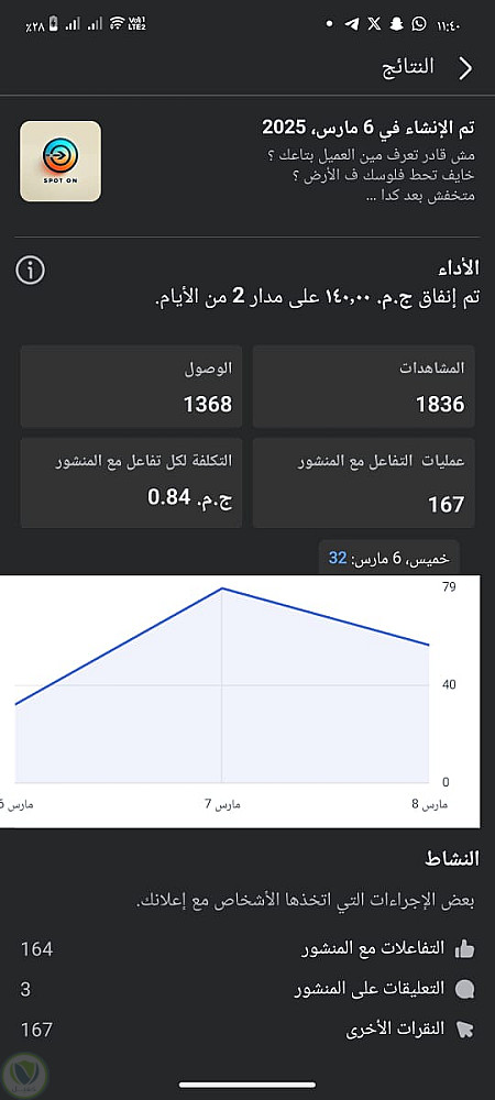 ملاحظات: الحملة حققت معدل تفاعل ممتاز في وقت قصير (يومين فقط) مع تكلفة منخفضة لكل تفاعل، مما يدل على استهداف ناجح وجودة في إعداد الإعلان