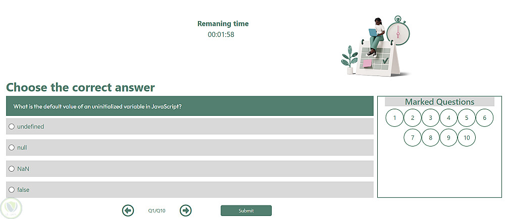 عند بدء الامتحان، يبدأ العداد تلقائيًا ويظهر الوقت المتبقي بشكل واضح للمستخدم.