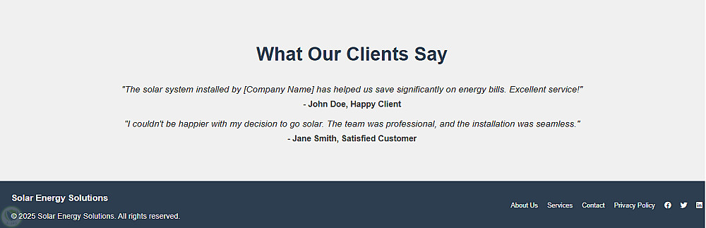 قمت بتصميم وتطوير صفحة هبوط احترافية لمشروع في مجال الطاقة الشمسية، تهدف إلى عرض الخدمات والمنتجات بطريقة جذابة ومنظمة، مع تحسين تجربة المستخدم وتحقيق أهداف تسويقية فعالة. تم تنفيذ العمل باستخدام: