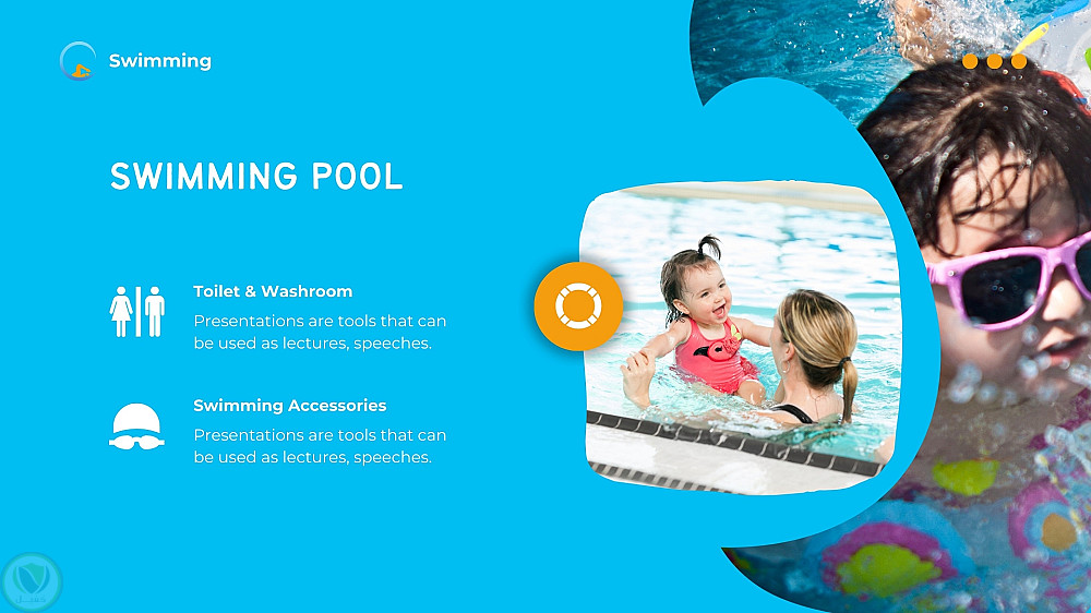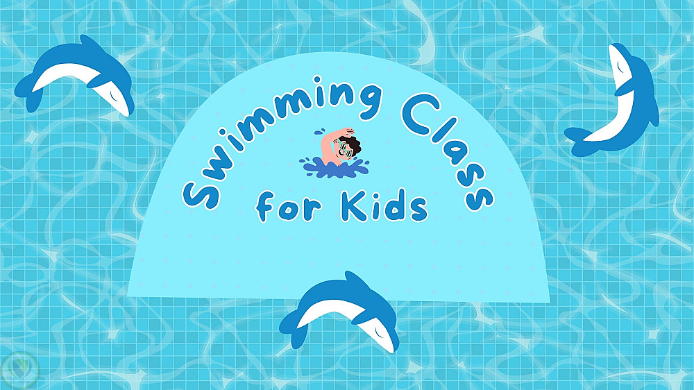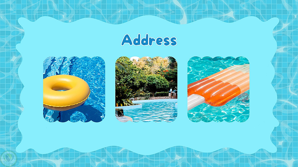 الألوان والعناصر البصرية: اخترت ألوان زرقاء منعشة ورسومات مرحة (دلافين – مسبح – أطفال)، لتعكس روح المرح والأمان.
