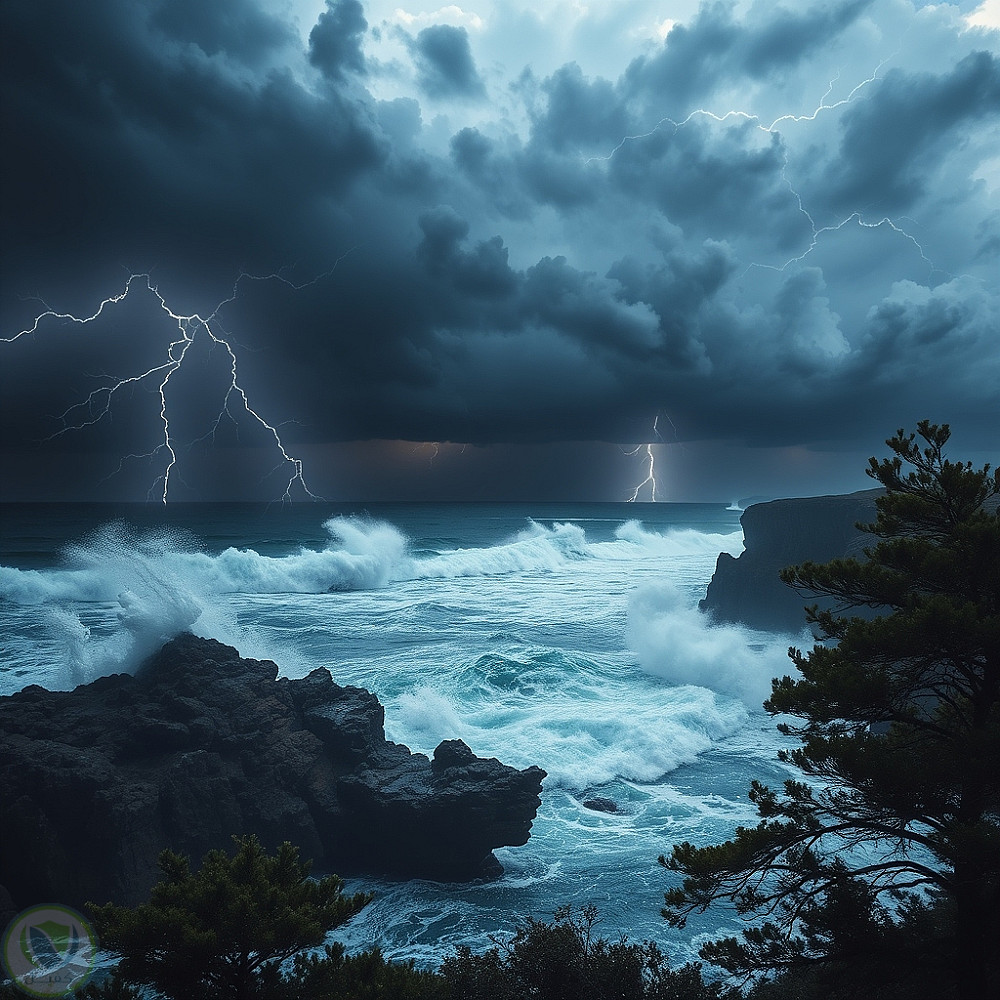 المحيط: أمواج ضخمة وعنيفة ترتطم بصخور الشاطئ، مما يُظهر قوة البحر وسط العاصفة.