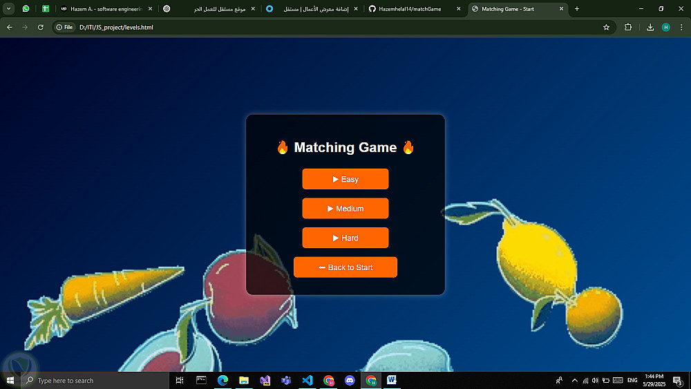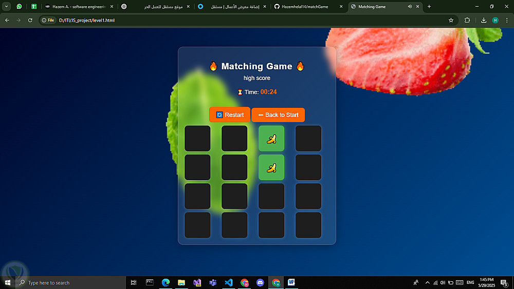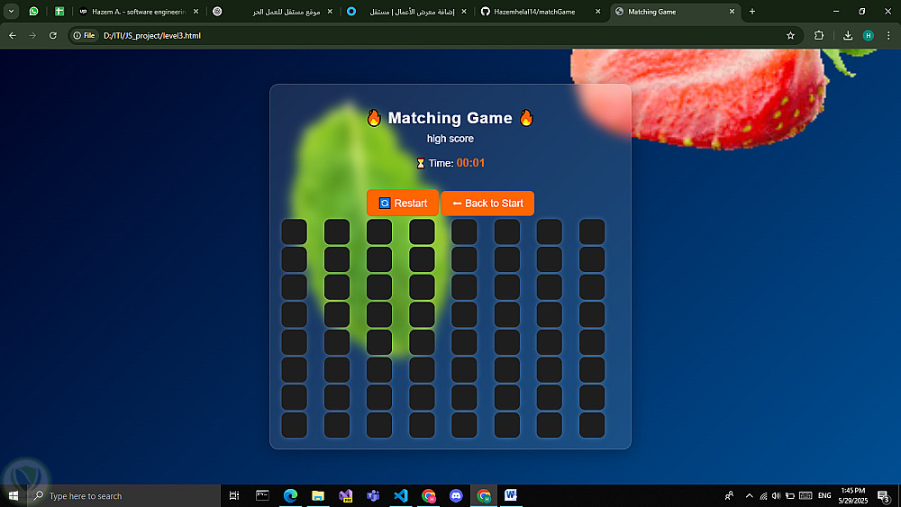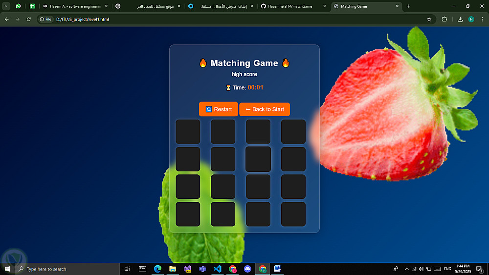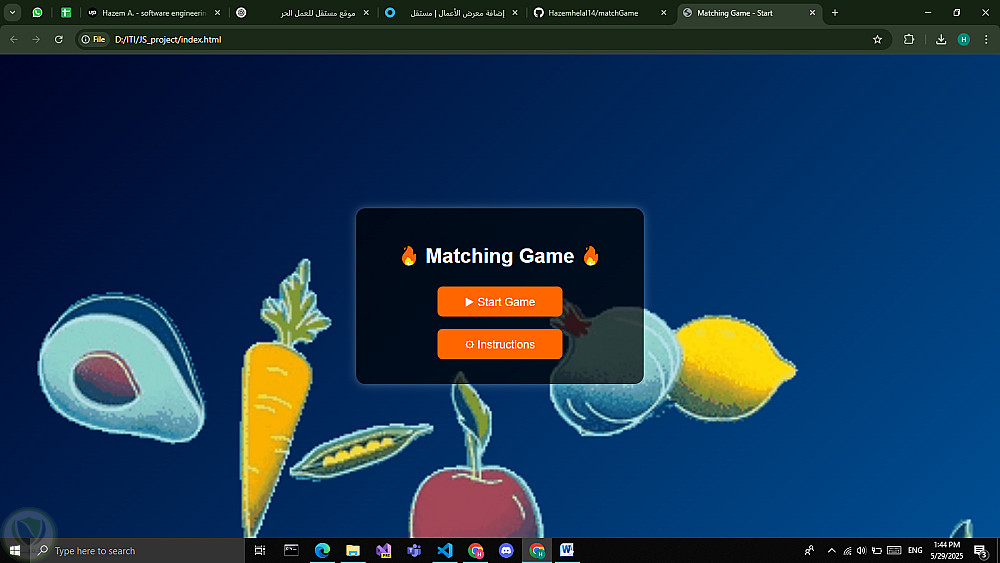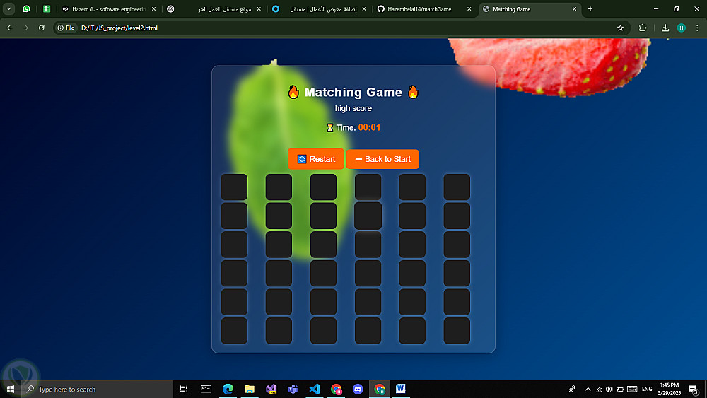 مشروع "Match Game" هو لعبة بسيطة وممتعة لتقوية الذاكرة، تم تطويرها باستخدام HTML، CSS، وJavaScript. تعتمد اللعبة على مبدأ مطابقة الأزواج المتشابهة من البطاقات في أقصر وقت ممكن وبأقل عدد من المحاولات.