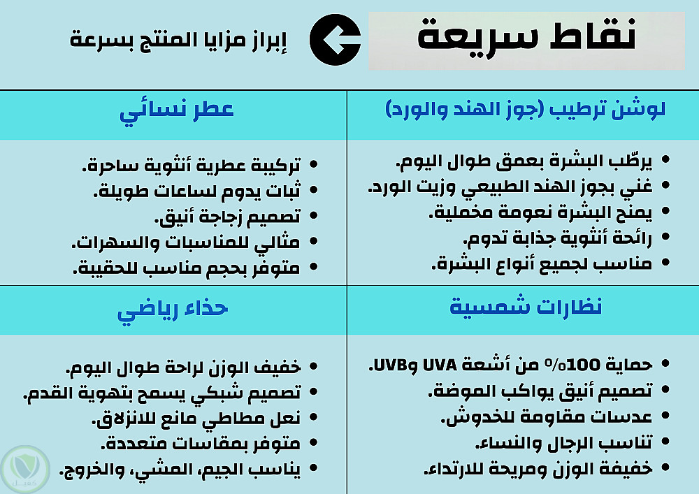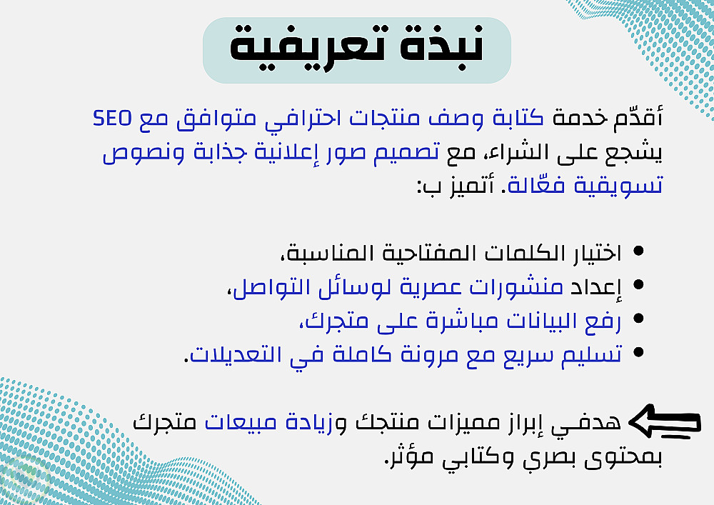 اكتشف نماذج من تصاميمي وخدماتي في كتابة وصف المنتجات، تصميم الصور الإعلانية، و تقديم النصوص التسويقية و الدعائية. جودة عالية وأفكار مبتكرة تساعدك على إبراز مشروعك بأفضل صورة.