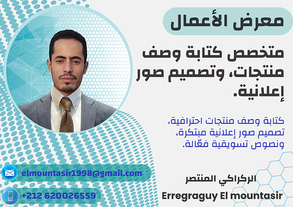 اكتشف نماذج من تصاميمي وخدماتي في كتابة وصف المنتجات، تصميم الصور الإعلانية، و تقديم النصوص التسويقية و الدعائية. جودة عالية وأفكار مبتكرة تساعدك على إبراز مشروعك بأفضل صورة.