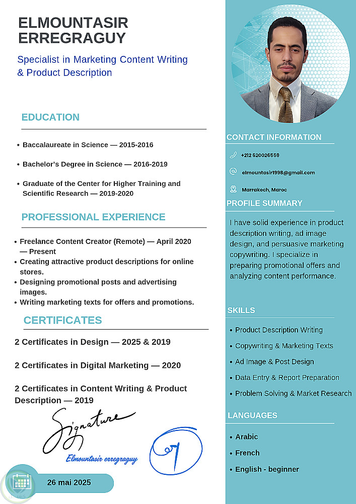 اكتشف نماذج من تصاميمي وخدماتي في كتابة السير الذاتية الاحترافية، و الخطاب التعريفي. جودة عالية وأفكار مبتكرة تساعدك على إبراز مشروعك بأفضل صورة.