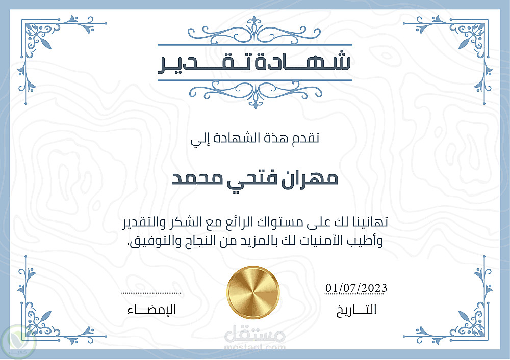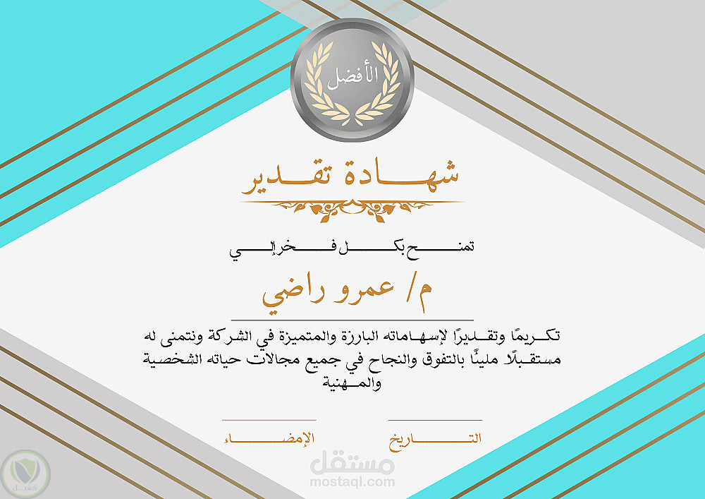 تصميم شهادة شكر وتقدير احترافية تُعبّر عن الامتنان والتقدير بطريقة أنيقة وجذابة. يتم تصميم الشهادة بما يتناسب مع طبيعة المناسبة أو الجهة المقدِّمة، مع إمكانية تخصيص الألوان، النصوص، الشعار، والتوقيعات حسب الطلب. مناسبة للمؤسسات التعليمية، الشركات، الدورات التدريبية، الفعاليات والمؤتمرات.