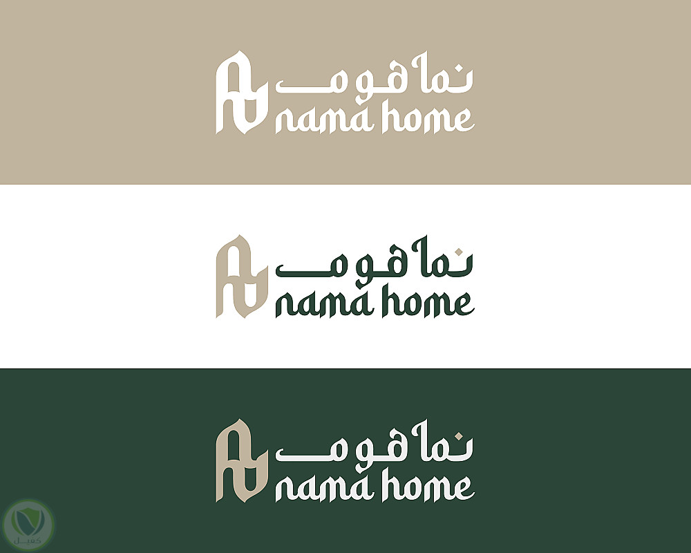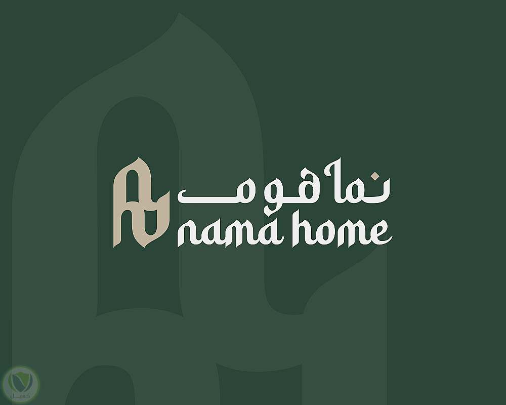 النص العربي والإنجليزي: يظهر اسم المؤسسة "نما هوم" باللغة العربية و"nama home" باللغة الإنجليزية، باستخدام خط معاصر تم تعديله وتعريبه ليتوافق بصريًا مع الطابع العام للشعار ويحقق توازنًا بين اللغتين.