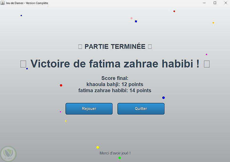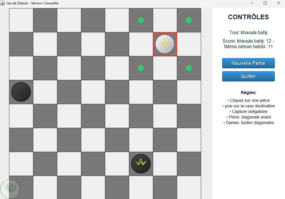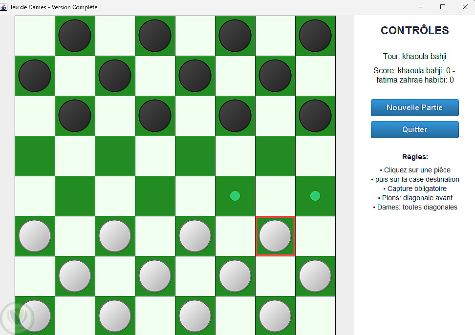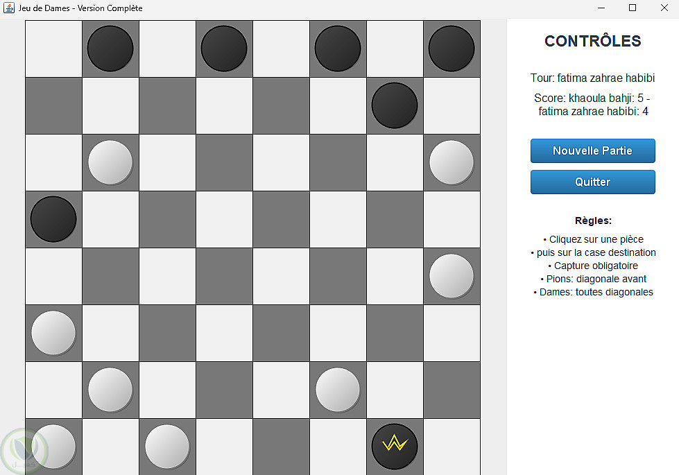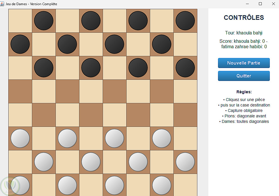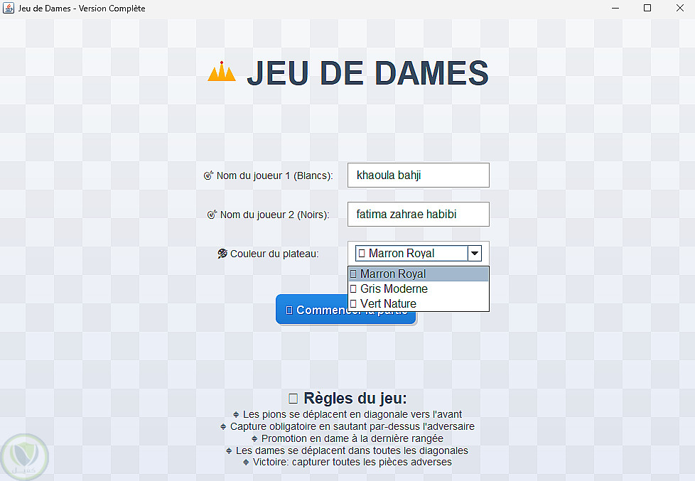 قمت بتطوير لعبة الداما (Jeu de Dames) بلغة Java مع واجهة رسومية احترافية باستخدام مكتبة Swing. هذا المشروع يحاكي لعبة الداما الكلاسيكية بشكل تفاعلي وسلس، مع التركيز على تجربة المستخدم والذكاء في تتبع الحركات واللاعبين.