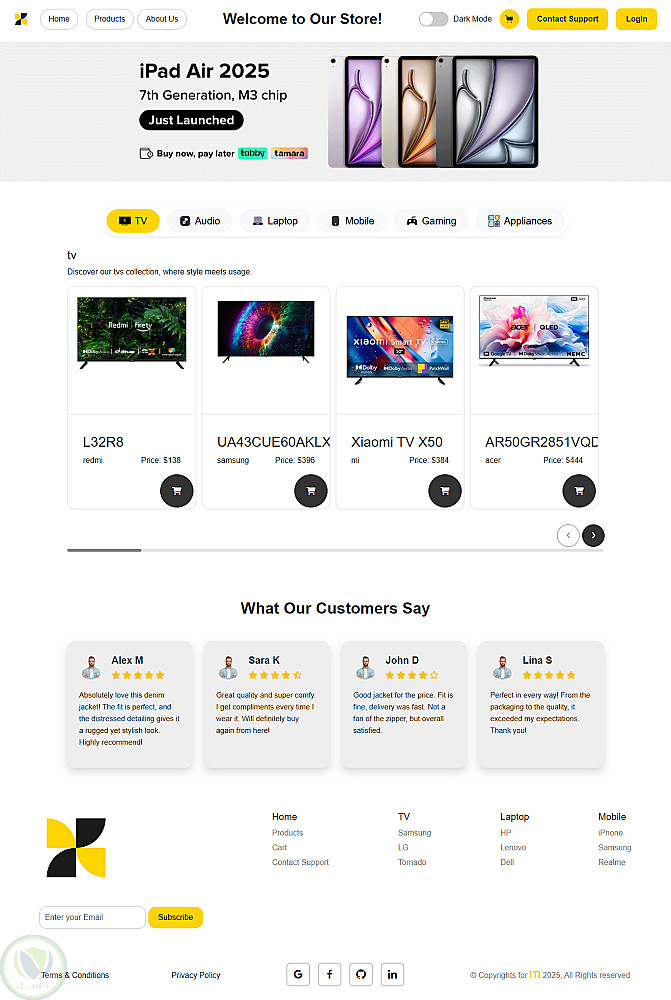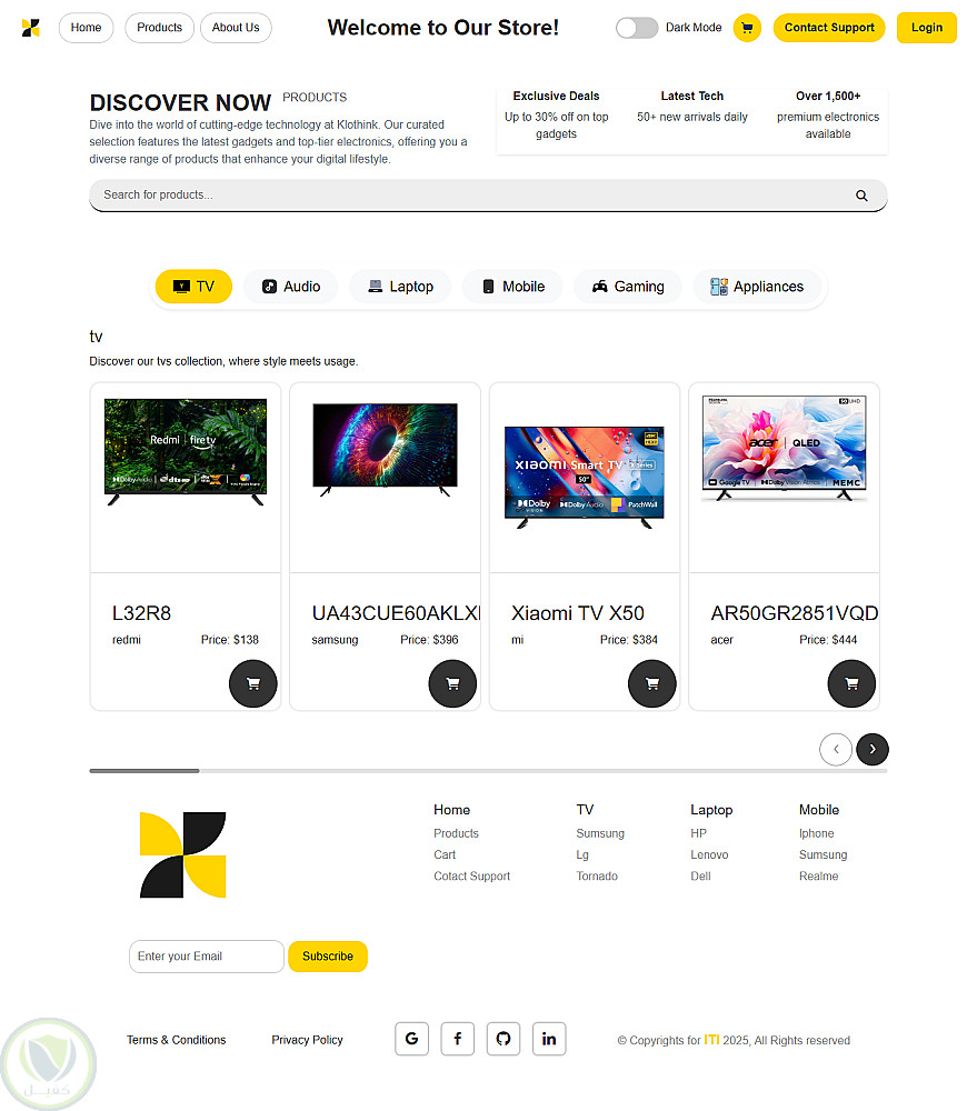 قمت بتطوير موقع تجارة إلكترونية حديث لبيع الإلكترونيات، يتميز بتصميم احترافي وتجربة مستخدم مميزة، مع دمج عدد من الميزات الديناميكية التي تحاكي المتاجر الواقعية.