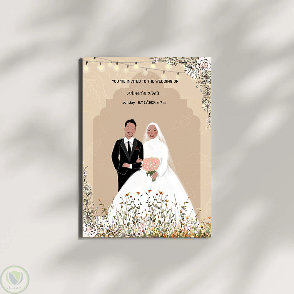 رسم كرتوني احترافي برسم العروسين بأسلوب كرتوني جذاب ومميز، مع إبراز التفاصيل التي تجعل الرسم شخصياً وخاص