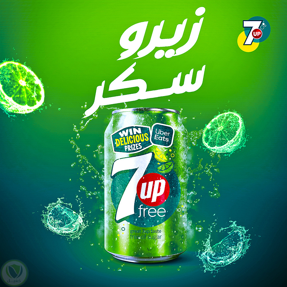 تصميم إعلاني يعكس انتعاش مشروب 7up بدون سكر، باستخدام ألوان جذابة وعناصر ليمون ومياه توحي بالحيوية. تم إبراز شكل العلبة بشكل واضح مع الحفاظ على هوية المنتج.