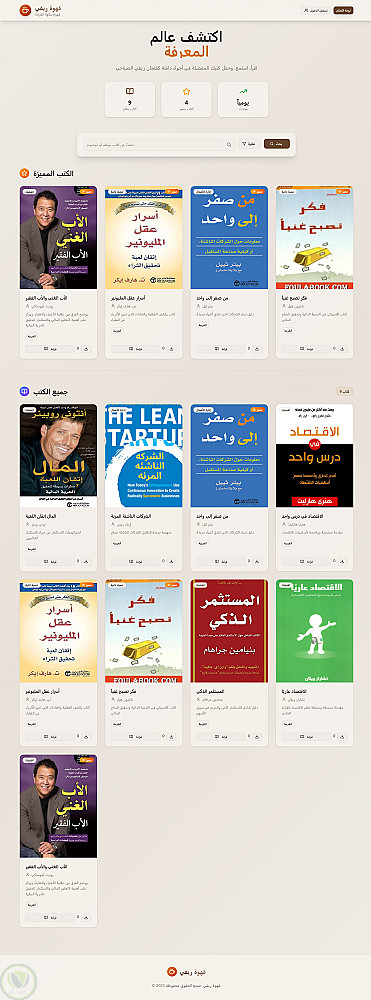 يتميز بتصميم احترافي وتأثيرات حركية تفاعلية، ويعرض كتبًا متنوعة في الاقتصاد والأعمال ومجالات أخرى، مع خيارات للقراءة، التحميل، أو الاستماع.