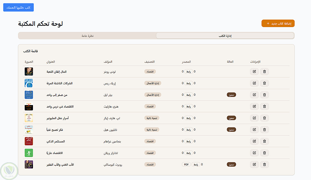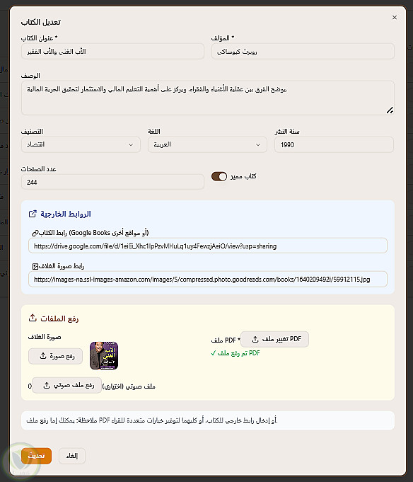 لوحة التحكم: إضافة، تعديل، حذف الكتب + رفع ملفات PDF وتخصيص صور الأغلفة بسهولة.