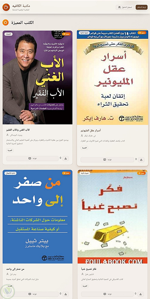 لوحة تحكم للزوار: بحيث يمكنهم إضافة الكتب للمفضلة والمتابعة من حيث كان التوقف أو إدارة حجوزات المقهى أو إدارة نقاط الولاء.