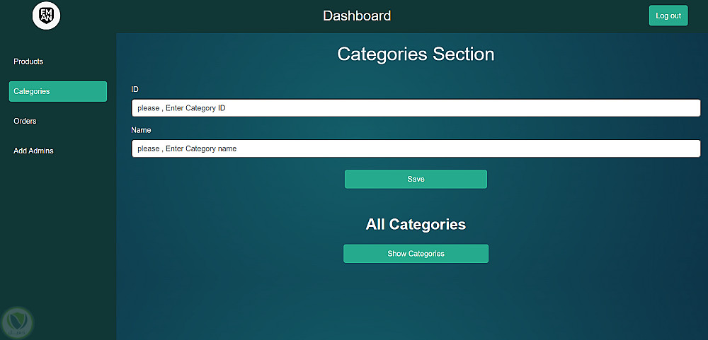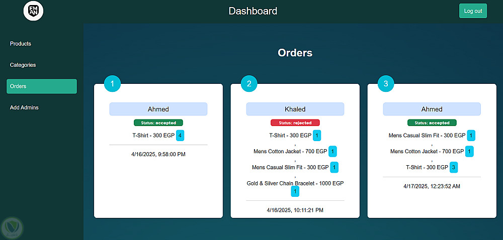 يمكن للمسؤولين إدارة المنتجات والفئات من خلال وظائف CRUD كاملة، وعرض جميع طلبات العملاء، والموافقة أو الرفض عليها.