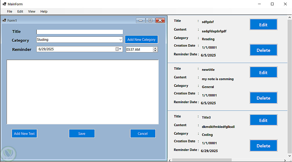 مدير الملاحظات الرقمية – تطبيق Windows Forms