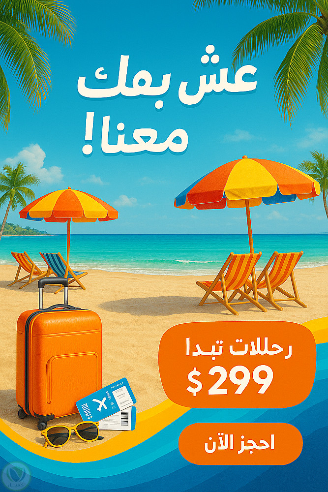 تم تصميم هذا الإعلان لصالح شركة سياحة ترغب في الترويج لرحلات صيفية بأسلوب عصري وجذّاب. الهدف من التصميم كان إبراز العرض بطريقة مباشرة وجذابة بصريًا، مع المحافظة على الهوية البصرية للعلامة التجارية.