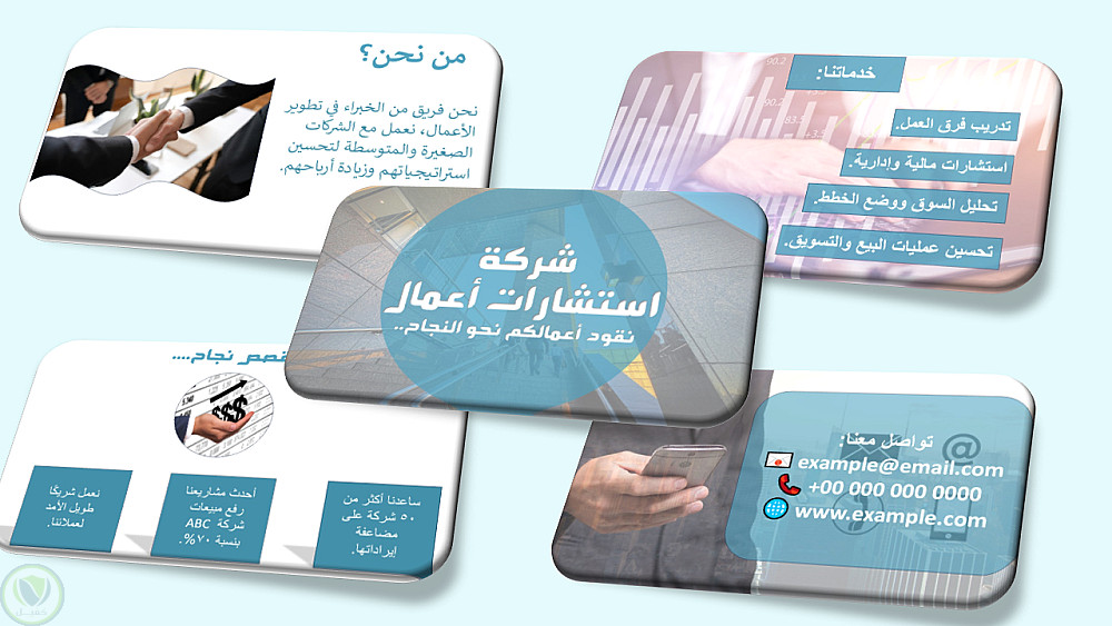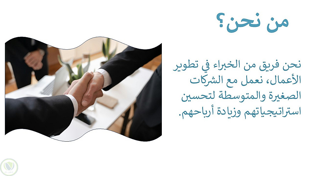 هذا العرض مصمم كنموذج تدريبي يوضح كيفية تقديم خدمات شركة استشارات أعمال بشكل احترافي مع خطة تسويقية مبسطة.