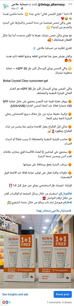 بوست علي صفحة الفيس بوك الخاص بصيدلية يعرض منتج واقي للشمس وهو بوباي جيل بلهجة مصريه واسلوب قريب للعمبل بالاضافة لاستخدام CTA مميز يجذب العملاء لشراء المنتج
