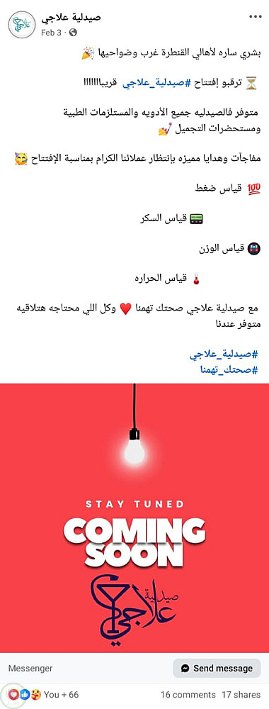 بوست ترويجي علي الفيس بوك للتنويه عن افتتاح صيدليه جديده موضحه خدمات الصيدليه للعملاء . بالاضافه الي رساله ترحيبيه بالعملاء وقت الافتتاح