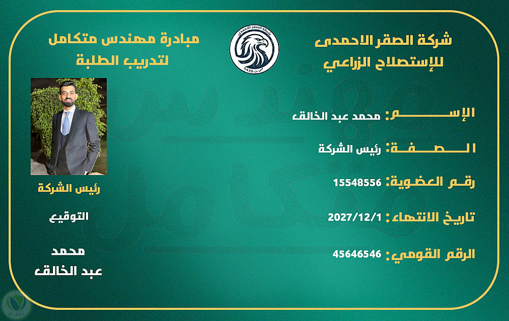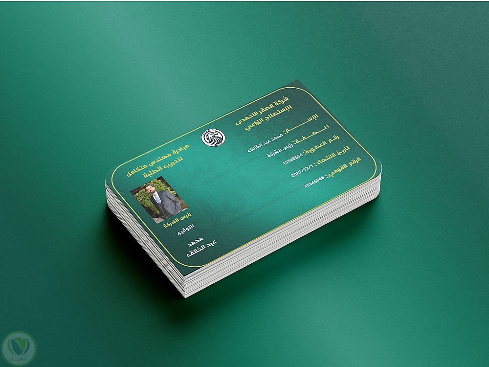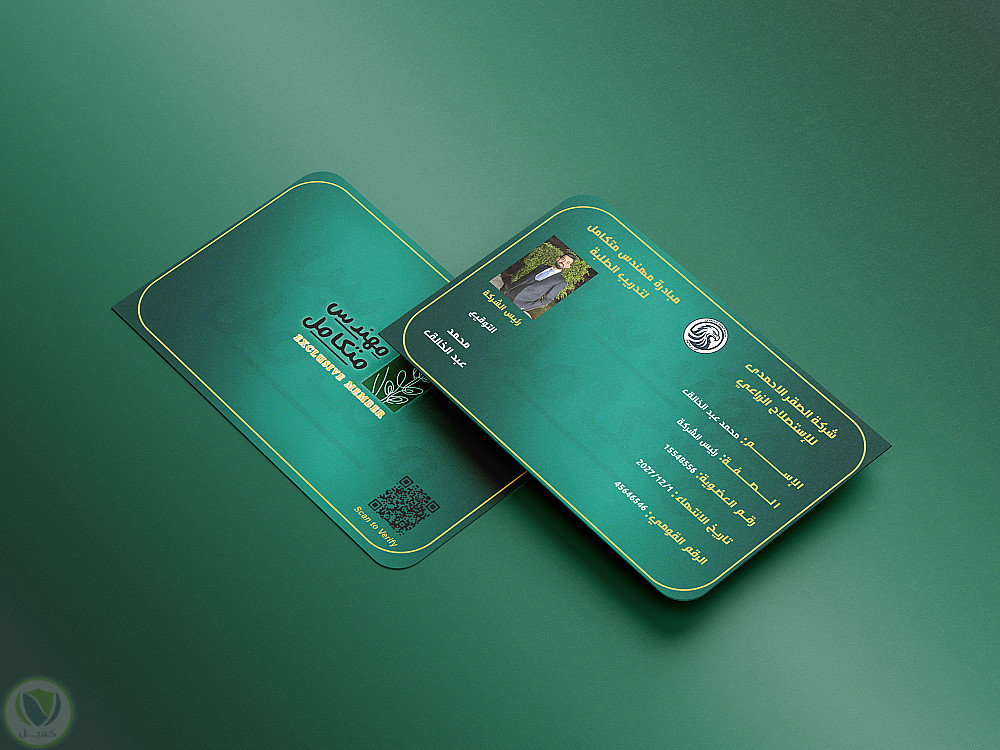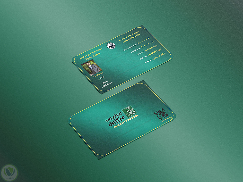 قمت في هذا التصميم بعمل كرت عضوية لشركة مهندس متكامل أبرزت بها الهوية الخاصة بالشركة عن طريق ابراز درجات اللون الاخضر في التصميم الذي يدل على الشركة