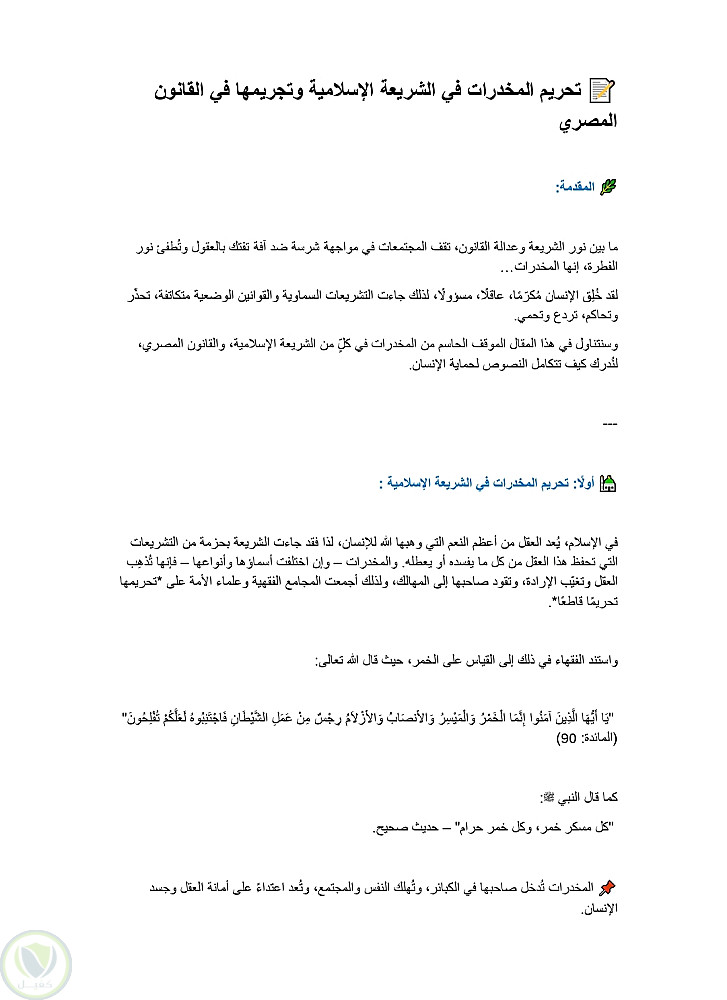 يتناول المقال بأسلوب علمي ومنهجي موقف الشريعة الإسلامية من المخدرات من منظور فقهي راسخ، مقرونًا بالأدلة من القرآن والسنة، مع تحليل قانوني لأهم بنود القانون المصري رقم 182 لسنة 1960 وتعديلاته، التي تُجرّم حيازة وتعاطي وترويج المواد المخدرة.