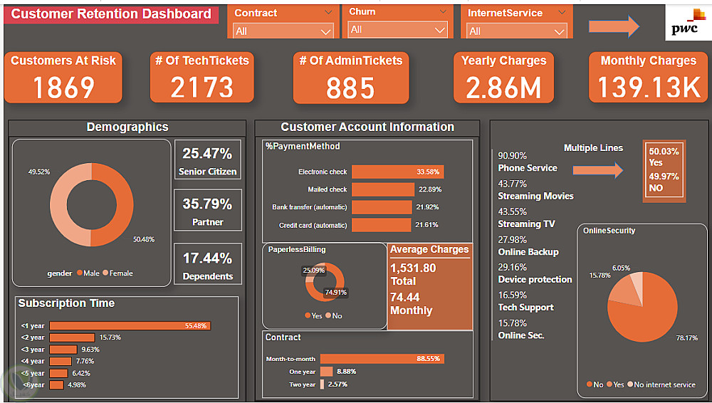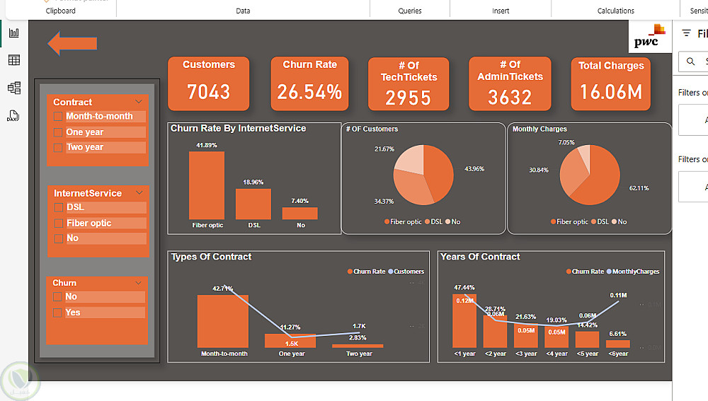 قمت بتطوير لوحات قيادة تفاعلية احترافية باستخدام Power BI لتحليل وفهم أسباب فقد العملاء (Churn Rate)،