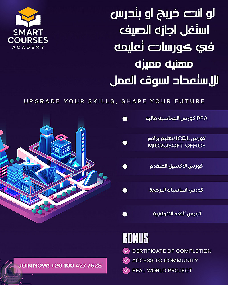 العناصر التفاعلية: دمج أيقونات السوشيال ميديا وتطبيقات التعليم (مثل Word, Excel, PowerPoint) يعطي إحساسًا بحداثة الدورة وتنوع أدواتها.