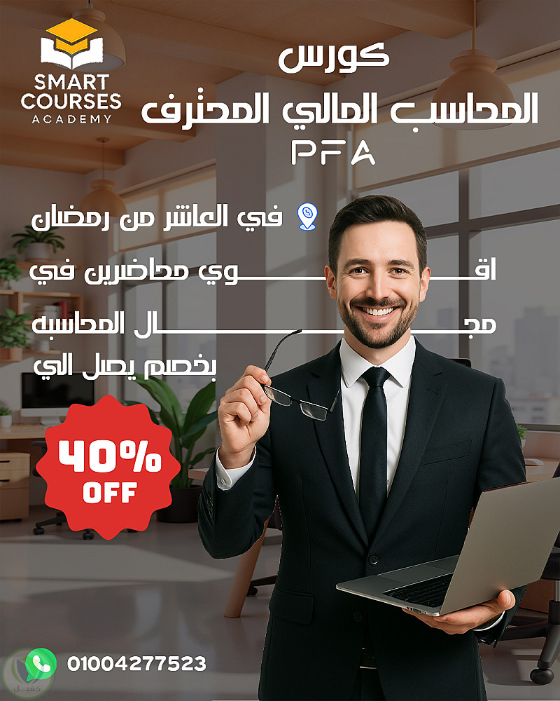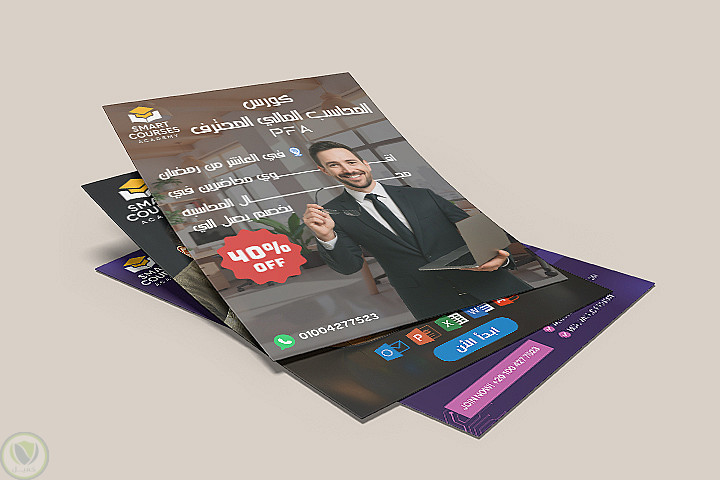 تصميم فلاير دعائي مطبوع لدورة "المحاسب المالي المحترف (PFA)" من منصة Smart Courses. يعكس التصميم اهتمامًا عاليًا بتقديم المحتوى التعليمي بصورة احترافية وجذابة:
